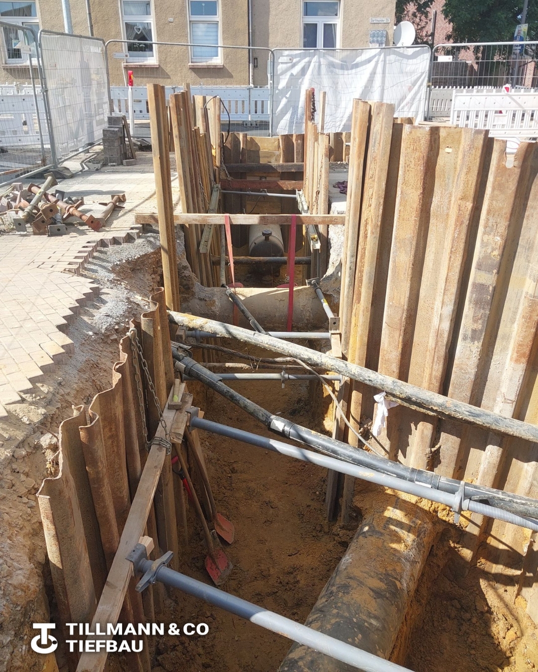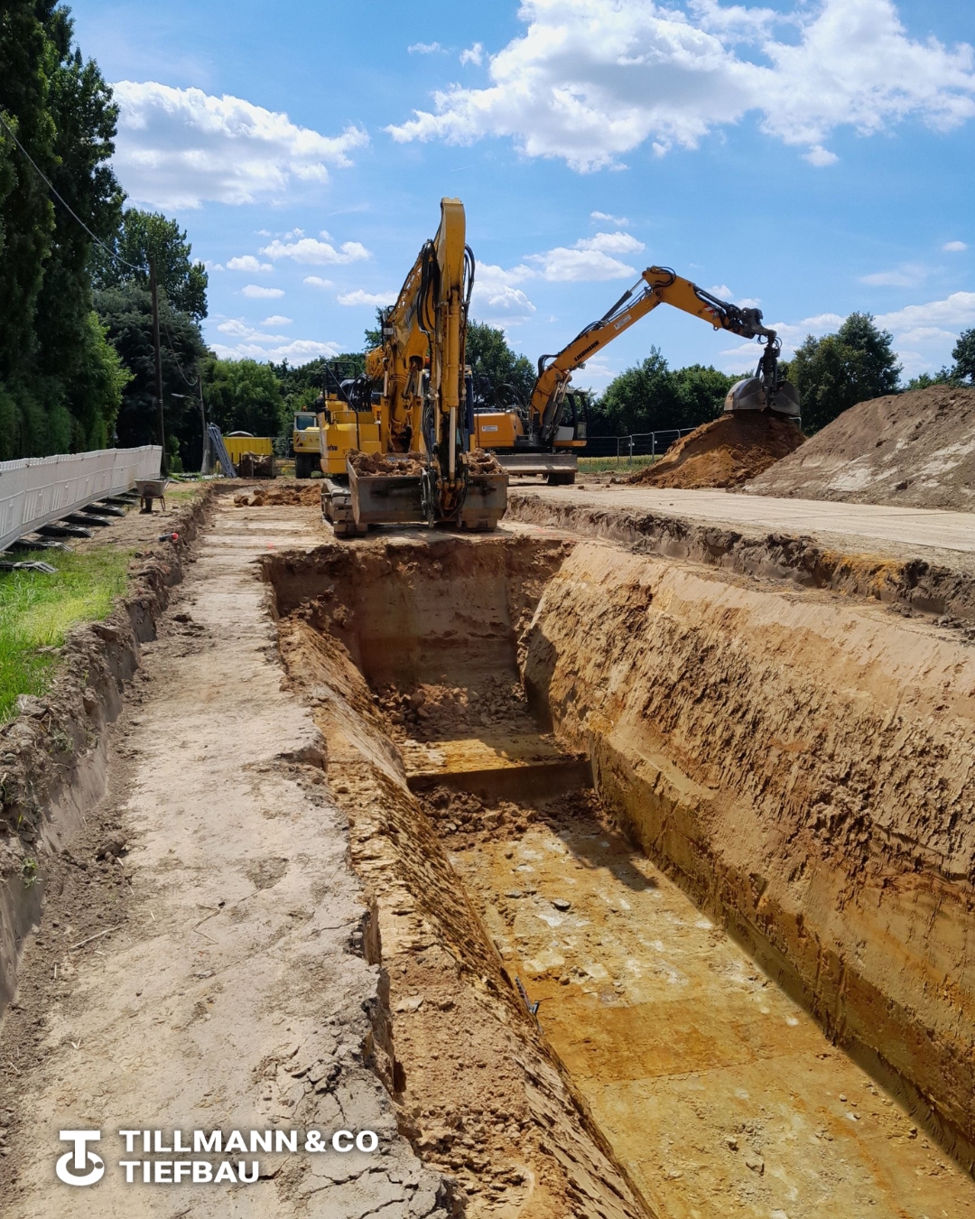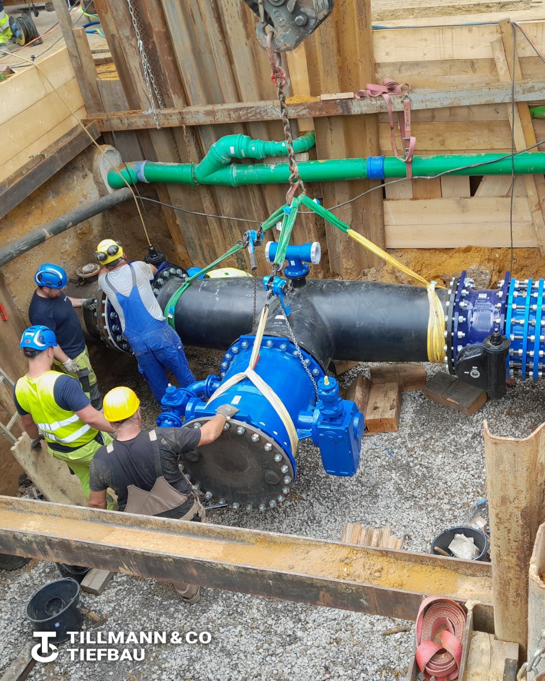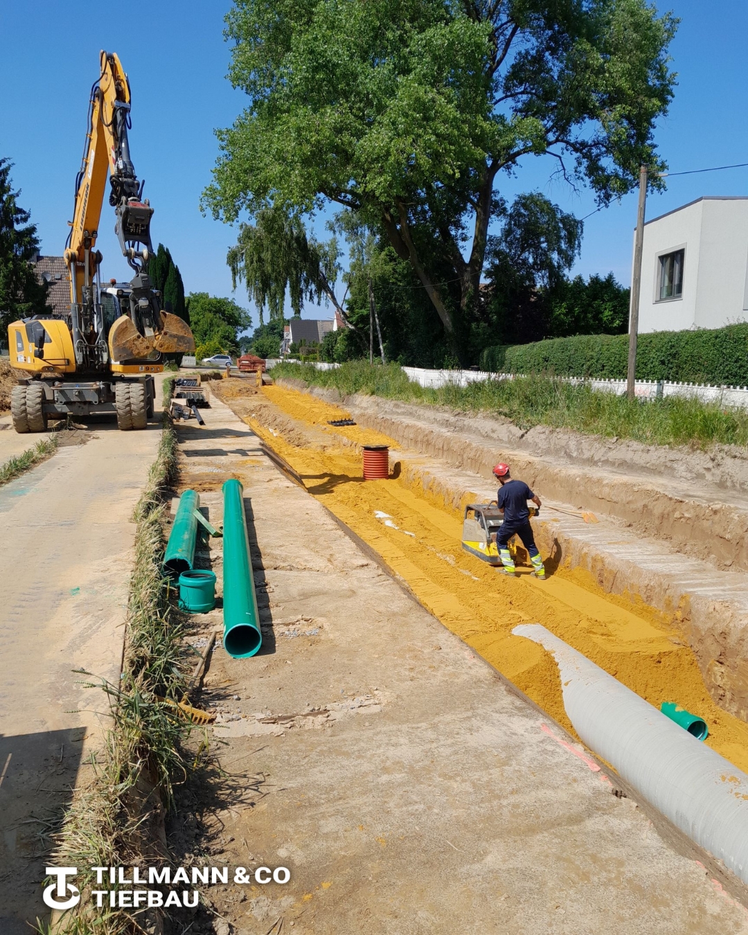 Auf einer Strecke von rund 600 Metern wurde eine DN700-Stahlrohrleitung als neue Wasserleitung in offener Bauweise verlegt. Zusätzlich haben wir Leerrohre und Entwässerungsleitungen mitverlegt.